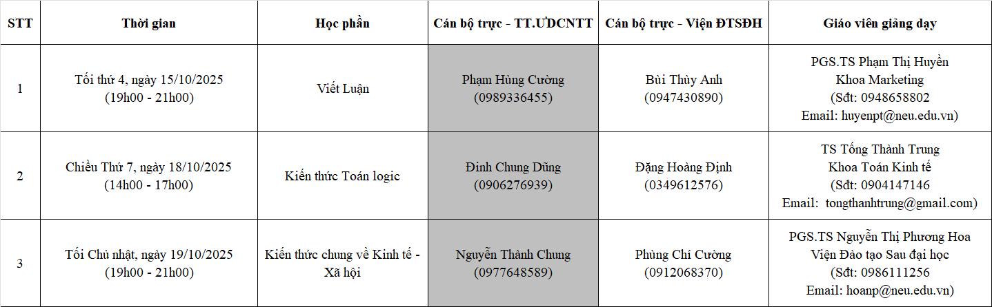 | Chiều Thứ 7, ngày 18/10/2025 (14h00 - 17h00) |